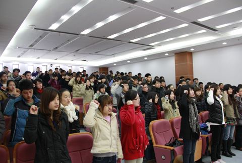 考取2012年华东理工大学研究生工业催化专业第一名的来霜霜同学作为优秀党员代表发言,她代表全体党员表态,要充分发挥党员的模范带头作用,秉承母校“明德、明学、明事”的校训。