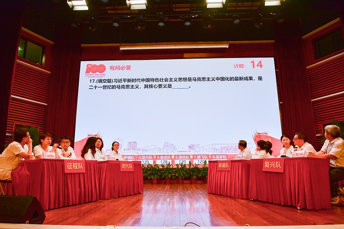 决赛分为教工组和学生组,围绕建党100周年光辉历程这一主题主线,聚焦重要历史时期的历史人物、历史事件、重要会议等。各代表队在“有问必答”环节中稳扎稳打,成绩不分上下,比分胶着,伴随着“红旗飘飘”、“我和我的祖国”等影音题目的“袭来”,赛况在“眼疾手快”的抢答环节中逐渐火热,观众频频为场上选手的精彩表现鼓掌喝彩,在最后的“绝处逢生”环节,比赛进入了白热化,各代表队主动“出击”,台下观众全情投入,现场观众也积极参与到中场答题环节。