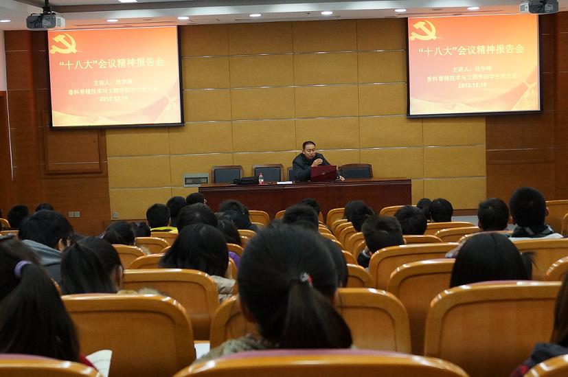2012年12月19日,香料学院学生党支部组织学生党员,分党校第24期入党积极分子培训班学员在图书馆B102参加了“十八大”会议精神主题报告会。报告会邀请到奉贤区委党校科研室主任,奉贤区“十八大”精神宣讲团成员杜学峰教授作为主讲人。会上,杜老师用生动的语言,丰富的实例,精辟的见解为到场同学详细全面的解读了党的十八大这次盛会。就十八大报告的核心内容以及同学们关心关注的热点问题进行了阐述和解答。精彩的报告不时的引发在场同学阵阵热烈的掌声。