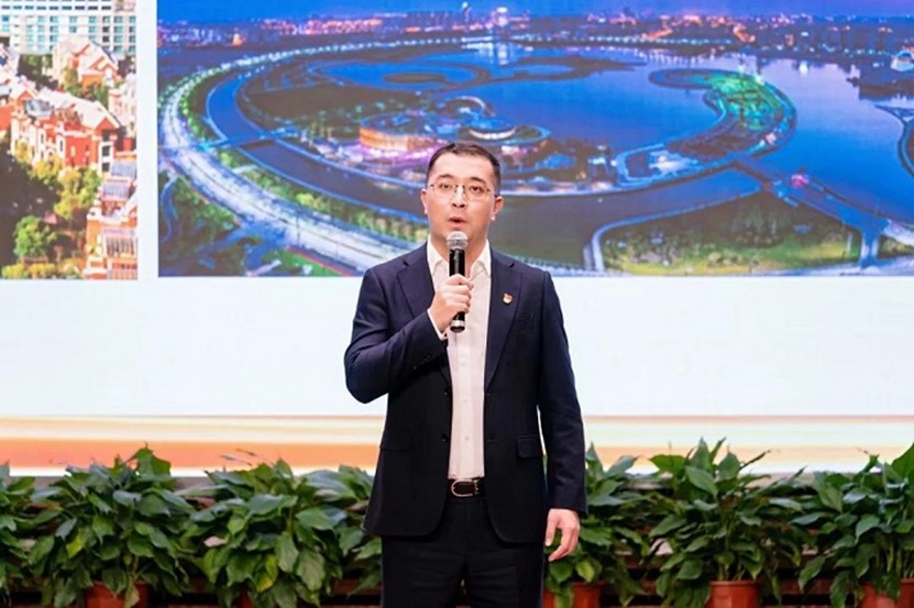 东方美谷企业集团股份有限公司副总经理朱豪君校友现场讲述奋斗历程。他秉持爱国、创新、诚信的企业家精神奋力前行,以高标准的工作推动东方美谷建设,推进产城融合和美丽健康事业发展。“赓续母校‘厚德精技、砥砺知行’精神内核,以上应人的使命担当与祖国同呼吸、共命运,绽放出时代风采!”朱豪君说。